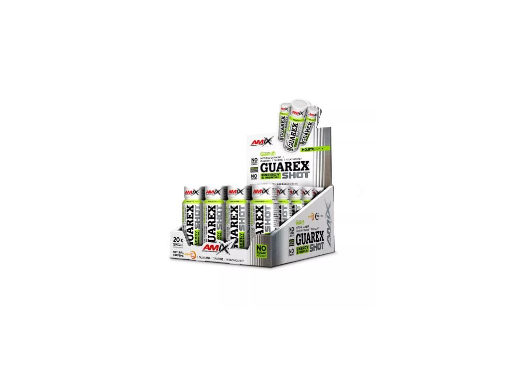 Amix Guarex® Energy & Mental Shot Mojito je tekutý stimulant určený pro rychlé doplnění energie a soustředění před výkonem i během dne. Kombinuje extrakt z guarany, VitaCholine® (cholin), taurin a přírodní enkapsulovaný kofein ActiveTR™, který se uvolňuje postupně.