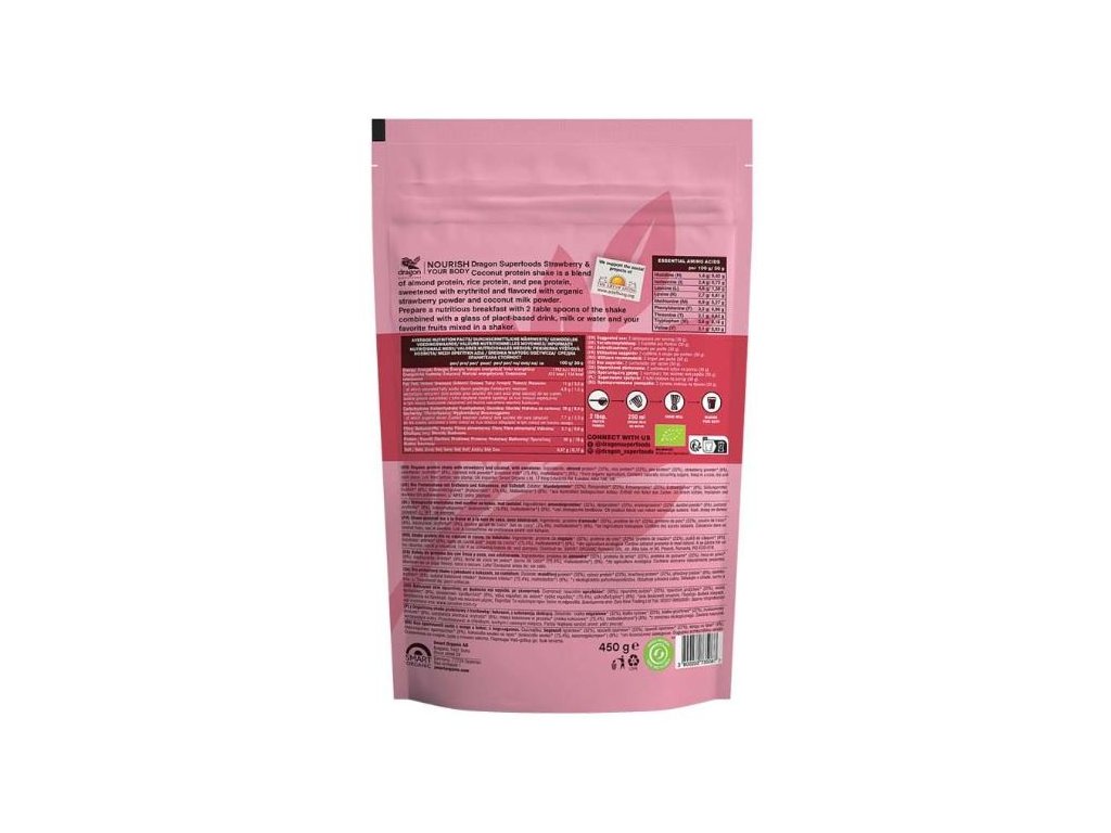 Rýžový protein, mandlový protein, kokosový cukr, jahody v prášku, kokosové mléko v prášku