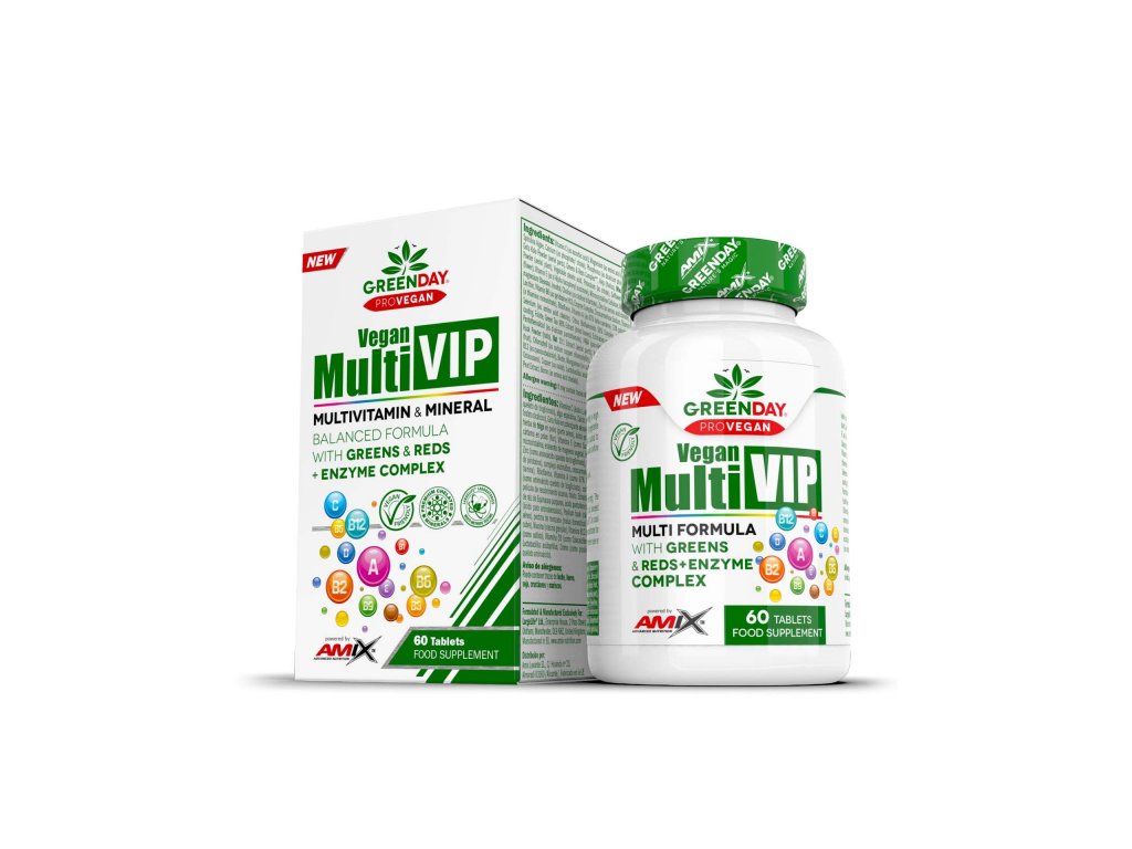 GreenDay® ProVegan Multi VIP je našlapaný multivitamín s 42 druhy ovoce a zeleniny, silnou dávkou vitamínů skupiny B, antioxidanty a rostlinnými extrakty.